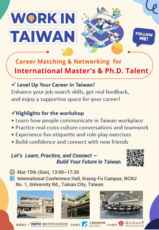 國科會「鼓勵外籍碩博士在臺產業就業推動計畫」由工研院產業學院執行,核心任務在於串聯校園與產業資源,協助外籍高階人才在臺就業,並強化臺灣國際化職場環境。該計畫特別舉辦以下兩場免費工作坊,邀請本校國際生參與